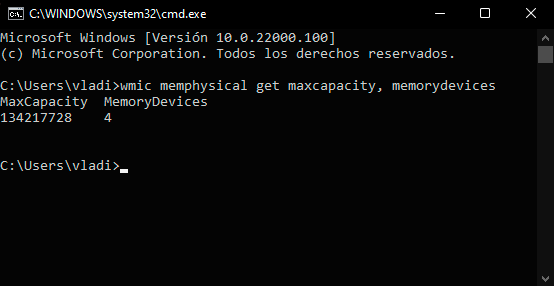 Hecho esto arrojará unos datos, donde “MaxCapacity” sería la cantidad de memoria soportada (en kilobytes) y “MemoryDevices” la cantidad de ranuras o slots de expansión. Para convertir estos datos de “kb” a “gb”, basta con dividir el valor “MaxCapacity” entre 1024 y el resultado entre 1024 nuevamente. En este caso dividiendo el valor obtenido entre 1024, queda en 128 gb por tanto mi placa base soporta 128 gb máximo. Y para saber qué cantidad soporta por cada slot, basta con dividir la cantidad de memoria entre la cantidad de ranuras, en este caso, debería dividir 128 entre 4, de modo que mi placa soporta 32 GB por slot.